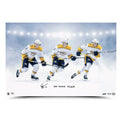 Coming off a season in which they won the Presidents Trophy (most points) for the first time in franchise history, the 2018-19 Nashville Predators came in with heavy expectations. And they didn’t disappoint, winning the Central Division for the second consecutive year with an overall record of 47-29-6. They came up short in the playoffs, but it was ultimately another successful building block toward bringing the Southern city an NHL championship. Talented right wing Eeli Tolvanen skated in four early-season games with the Predators, including a home game against the Blackhawks that saw Tolvanen score his first career NHL goal. It came in the first period of a 5-2 Predators win. He also assisted on a Craig Smith goal later in the period. The flashy Finnish forward is a huge part of Nashville’s future. Tolvanen has autographed and inscribed “’19 Central Champs” on this limited edition (25) “Triple Exposure” 24x16 designed image in black paint pen. His signature and inscription are deemed authentic by virtue of Upper Deck Authenticated’s Five-Step Process.