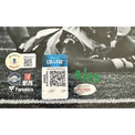 This Notre Dame Fighting Irish 11" x 14" spotlight photograph titled "Diving Touchdown" has been personally hand-signed in green ink by Game Day Legends exclusive athlete, Kyren Williams. Williams added the inscription "Go Irish." It comes with an individually numbered, tamper-evident hologram from Beckett Authentic as well as Game Day Legends. To ensure authenticity, the hologram can be reviewed online. This process helps to ensure that the product purchased is authentic and eliminates any possibility of duplication or fraud. This spotlight photograph is limited to just 23 and you will receive a random number from the edition.  Kyren Williams is the newest exclusive athlete to the Game Day Legends family.