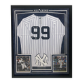 This is an authentic New York Yankees jersey autographed by Aaron Judge with the inscription "2022 AL MVP." This authentic jersey is custom framed and includes two 8" x 10" photos of Judge. In between the two photos is a custom acrylic Yankees logo. This is a showstopper. It truly must be seen in person to understand how amazing this really is. The overall dimensions of this framed jersey is 34" x 44" and it ready to hang on your wall.