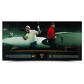 This unique 36"x18" piece highlights two of the greatest golfers ever, showcasing iconic moments in both Tiger's and Jack's careers. The images were captured exactly 11 years apart on the same day, April 13th. Each golfer has broken a multitude of records and the 'Masterful' collage features specific achievements. For Tiger Woods, the record was set at the 1997 Masters Tournament when he was 21 years old and won his first professional Major. He won the tournament by a record 12 strokes and is still tied for the record with a 270 as a total tournament score. On the same day 11 years earlier, Jack won his 18th and final professional major at the 56th Masters Tournament at the age of 46. This image shows Jack raising his putter in celebration on the 17th hole after completing an eagle-birdie-birdie run. The background images show each golfer displaying extreme focus on the greens, and the main images show each golfer celebrating after a shot. Their signatures were inked in gold paint pen. Tiger and Jack's autographs have been authenticated by virtue of Upper Deck Authenticated's Five-Step Process.