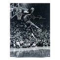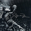 Seattle was the scene of the 1987 Slam Dunk Contest, and the event featured a who's who of high flyers in Jerome Kersey, Clyde Drexler, Tom Chambers, Ron Harper, Gerald Wilkins and a young Michael Jordan. It was a legendary competition with Jordan matching Portland teammates Kersey and Drexler dunk for acrobatic dunk. While Jordan garnered high marks for his cradle dunk as well as his free-throw line jam, the dunk captured in this image was one of his most memorable in the history of the competition. He slid in from the baseline, flew practically sideways and double-pumped and threw it down with one hand for a perfect 50 score to secure his first career Slam Dunk Contest title. He would win again the next year in Chicago to become the first back-to-back winner. The high-flying moment of incredible athleticism is captured here in this humongous image. Jordan has autographed this "Frozen in Time" 30" x 40" image in silver paint pen. His signature is deemed authentic by virtue of Upper Deck Authenticated's Five-Step Process. This photo is limited to 123 and you will receive a random number from the edition. Includes certificate of authenticity and hologram from Upper Deck Authenticated. This signature is guaranteed authentic through the Upper Deck hologram system.