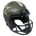 This authentic Salute to Service helmet has been personally hand-signed by CeeDee Lamb. It is officially licensed by the National Football League and comes with an individually numbered, tamper-evident hologram from Fanatics Authentic. To ensure authenticity, the hologram can be reviewed online. This process helps to ensure that the product purchased is authentic and eliminates any possibility of duplication or fraud.
