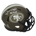 This San Francisco 49ers Salute to Service Speed mini helmet has been personally hand-signed by Joe Montana with the added inscription "Joe Cool." It comes with an individually numbered, tamper-evident hologram from Fanatics Authentic. To ensure authenticity, the hologram can be reviewed online. This process helps to ensure that the product purchased is authentic and eliminates any possibility of duplication or fraud. This helmet is limited to 24 and you will receive number "1" from the edition.