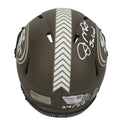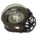 This San Francisco 49ers Salute to Service Speed mini helmet has been personally hand-signed by Joe Montana with the added inscription "Joe Cool." It comes with an individually numbered, tamper-evident hologram from Fanatics Authentic. To ensure authenticity, the hologram can be reviewed online. This process helps to ensure that the product purchased is authentic and eliminates any possibility of duplication or fraud. This helmet is limited to 24 and you will receive number "24" from the edition.