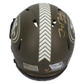 This San Francisco 49ers Salute to Service Speed mini helmet has been personally hand-signed by Joe Montana and Jerry Rice. It comes with an individually numbered, tamper-evident hologram from Fanatics Authentic. To ensure authenticity, the hologram can be reviewed online. This process helps to ensure that the product purchased is authentic and eliminates any possibility of duplication or fraud. This helmet is limited to 24 and you will receive number "16" from the edition.