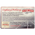 Brett Favre Autographed/Inscribed "SB XXXI Champs" Green Bay Packers Green Bay Packers Championship Belt LE 4 of 4 Game Day Legends / BeckettThis Green Bay Packers WWE Championship Belt has been personally hand-signed by Brett Favre with the inscription "SB XXXI Champs." It comes with an individually numbered, tamper-evident hologram from Beckett. To ensure authenticity, the hologram can be reviewed online. This process helps to ensure that the product purchased is authentic and eliminates any possibility of duplication or fraud.This belt is also authenticated by Game Day Legends and is limited to just 4.    Includes hologram! Brett's signature is guaranteed authentic through the Beckett Authentication system. MONEY BACK GUARANTEE! If for any reason you are not completely satisfied with the quality or authenticity of your purchase, we will gladly give you a full refund or exchange, whichever you prefer up to 30 days after purchase. Please feel free to e-mail us with any questions. Thank you. Authenticator Pre-Certified Authenticator: Beckett Authenticated Describe how you came to possess this item: Game Day Legends is a fully authorized dealer for Upper Deck Authenticated as well as Mounted Memories and Steiner Sports. Other information about you and / or the item: Game Day Legends strives to deliver the most authentic in sports memorabilia from trusted companies like Mounted Memories, Steiner Sports and Upper Deck Authenticated. If it exists, we can find it for you!