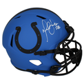 This Indianapolis Colts 'RAVE' full size replica speed helmet has been personally hand-signed by Marshall Faulk. It comes with an individually numbered, tamper-evident hologram from Beckett Authentic. To ensure authenticity, the hologram can be reviewed online. This process helps to ensure that the product purchased is authentic and eliminates any possibility of duplication or fraud.